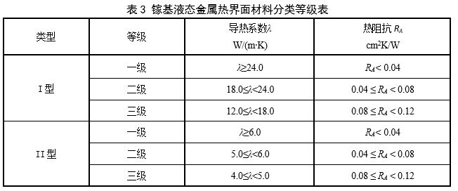 綜合我國鎵基液態(tài)金屬熱界面材料產(chǎn)品技術(shù)現(xiàn)狀和導(dǎo)熱系數(shù)效益極限,規(guī)定了鎵基液態(tài)金屬熱界面材料產(chǎn)品的等級(jí)要求(表3),其中,熱阻抗是在不超過300 kPa壓力下的測量值。